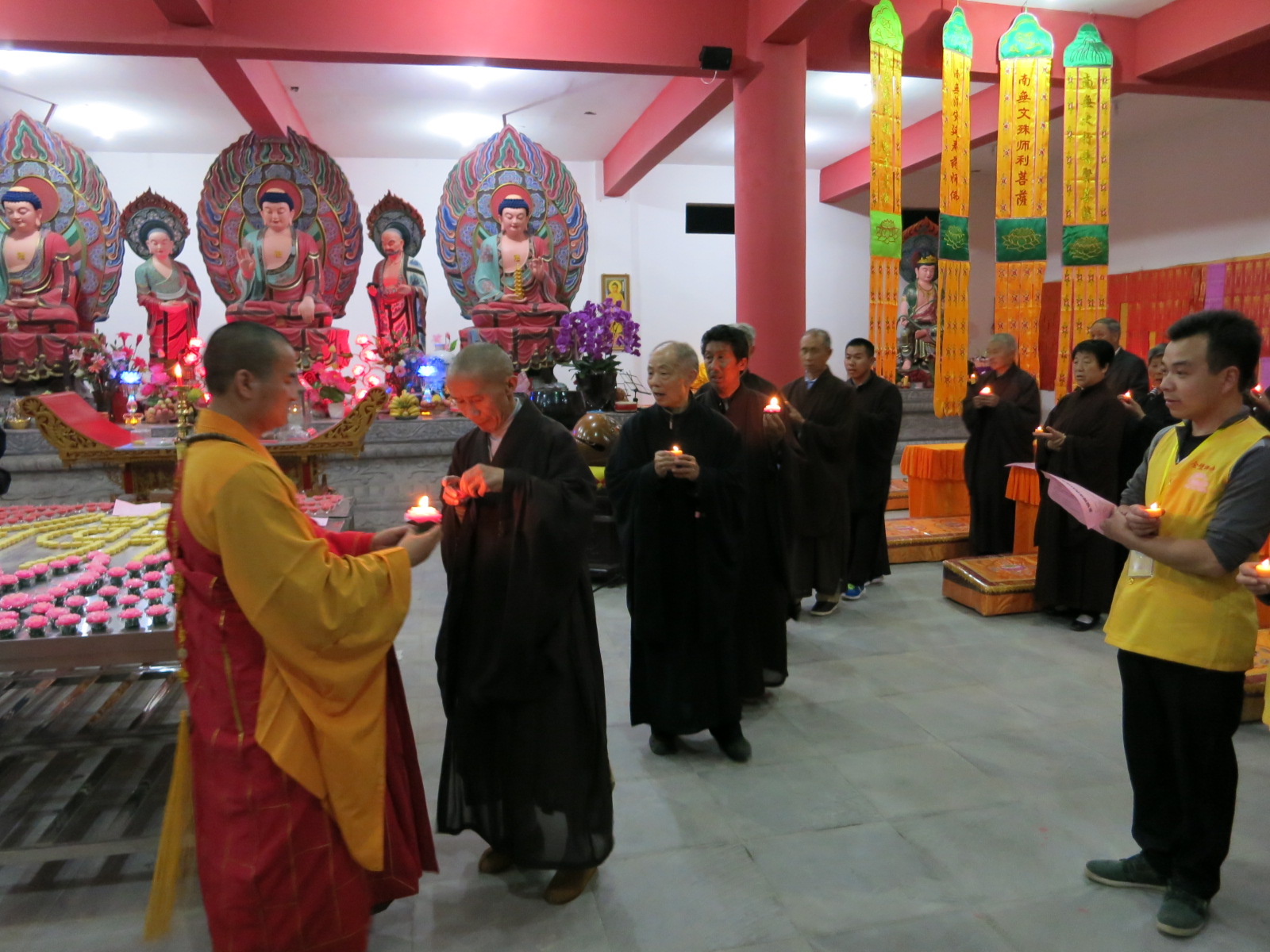 尔后,香灯师点烛交与掌坛师,他双手举烛唱偈:“一堂宝烛在当前,未敢先将凡火燃;今借祖师三昧火,枝枝头上灿红莲。”此时,香烟环绕,灯烛辉煌,掌坛师炳烛念道:“拈起分明在目前,头头挺露照三干;青光不夜长春景,与我心灯二样燃!”僧众三称“南无灯养活菩萨摩诃萨”!